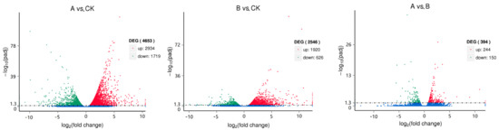 A total of 5292 DEGs were found by differential expression screening analysis of unigenes from three groups of samples, which accounted for 3.7% of the total annotated unigene. When the unigene was compared with the KEGG database, 25,479 genes were annotated, and 130 pathways were involved. These annotations included statistics concerning the first 20 pathways of differential gene enrichment in the CK group, group A, and group B. These groups were mainly enriched with phenylpropanoid biosynthesis, plant hormone signal transduction, amino acid and nucleotide sugar metabolisms, and starch and sucrose metabolisms. The annotation analysis is shown in Figure 4. Moreover, the pathways related to the synthesis of terpenoids mainly included terpenoid skeleton biosynthesis, sesquiterpene and triterpene biosynthesis, monoterpenoid biosynthesis, diterpene biosynthesis, ubiquinone and other terpenoid quinone biosynthesis. Using the DESeq algorithm to analyze the differences between unigenes in three groups of samples, the screening threshold was padj < 0.05. The results showed that compared with the control group, there were 4653 differential genes in group A, including 2934 upregulated genes and 1719 downregulated genes, whereas group B had 2546 differential genes, including 1920 upregulated genes and 626 downregulated genes. There were only 394 differential genes between Group A and Group B, including 244 upregulated and 150 downregulated genes (Figure 5).