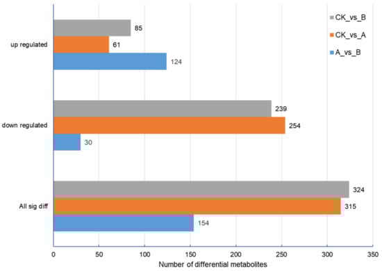 By screening the differential metabolites of the three groups of samples, there were 315 differential metabolites between the control group and treatment group A, 324 differential metabolites between the control group and treatment group B, and only 154 differential metabolites between treatment group A and treatment group B (Figure 6). Statistics concerning the number of different metabolites in each group are shown in Table S3.