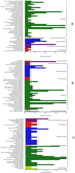 Classification diagram of KEGG, a differential metabolite. (a) CK vs. A; (b) CK vs. B; (c) A vs. B. Note: The ordinate is the name of the KEGG metabolic pathway, and the abscissa refers to the number of metabolites that were annotated on the pathway as a proportion of the total number of metabolites that were annotated.