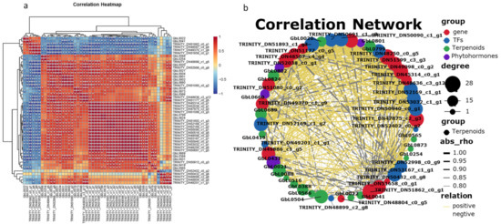 Correlation analysis between differentially expressed genes and metabolites that are related to terpene synthesis in ginkgo leaves. (a) Correlation clustering heat map between core differential metabolites and differentially expressed genes; (b) correlation network diagram between ginkgolides, differential hormones, and hot genes. ** represents very significant level; * represents significant level.