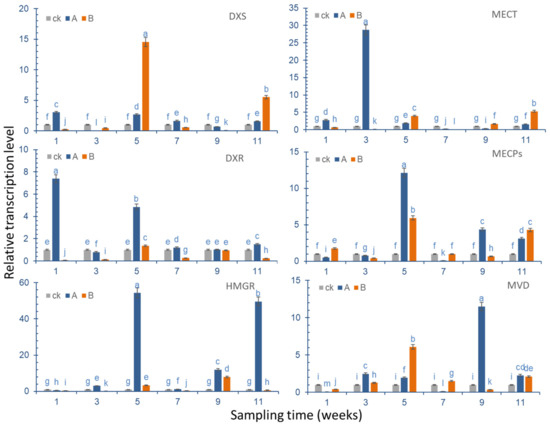 Relative expression level of six differentially expressed genes in the ginkgo terpene lactone synthesis pathway at different sampling points. Note: CK. control group; A. foliar spraying; B. root pouring. The lowercase letters a–m on the bar reflects the 5% significant level.