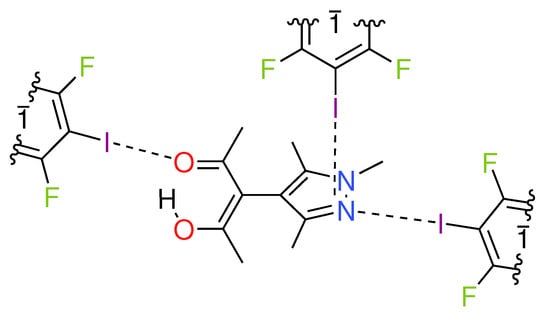- Another short contact exists between the acetylacetone keto O1 and I2 of the second TFDIB moiety, occupying the positions close to the inversion center with Wyckoff letter ; it amounts to 2.929(3) Å. As expected, the C–I bond in this moiety is less elongated than the C–I bond in the I⋯N halogen bond A. This is due to the weaker basicity of oxygen compared to the iminic nitrogen of the pyrazole moiety. For similar motifs, such as pyridyl substituted β-diketones, I⋯Oketo amounts to about 3.05 Å (refcodes TAXYID [], AWUWOH‡ []). In all cases of protonated β-diketones, the halogen bond acceptor is the keto oxygen, not the enol bond acceptor. Chemical intuition suggests that the keto oxygen is associated with the more negative charge. In several cocrystals of β-diketonato complexes with TFDIB, two oxygens of different β-diketonate ligands act as halogen bond acceptors; the XB is oriented more or less symmetrically bifurcated towards the midpoint between these two oxygen atoms [,].
