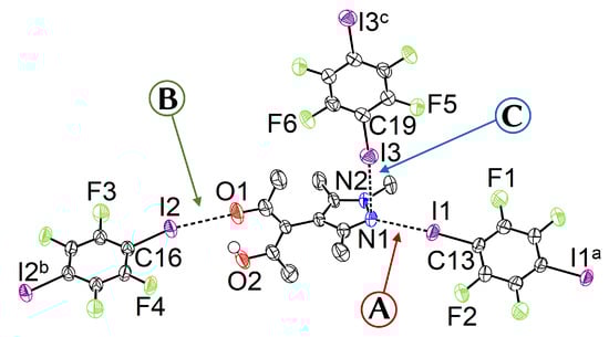 - Last but not least, I3 from the third symmetry independent TFDIB moiety, located around the inversion center with Wyckoff position , acts as XB donor towards the pyrazole π-system with a distance of 3.2157(3) Å. As expected by the theoretical electrostatic potential for pyrazoles [], the closest contact atom for I3 is the iminic N1 with a distance of 3.241(4) Å. Lewis basic π-systems as XB acceptors are known in literature, e.g., for cyclopentadienyl ligands [], imidazoles [], or carbazoles [], and have been evaluated theoretically [,,]; however, to the best of our knowledge, no pyrazole-π⋯I interactions with perfluoronated iodobenzenes have been reported to this date. This is also due to the competition with the more prominent I⋯N XB, as present in interaction A.
