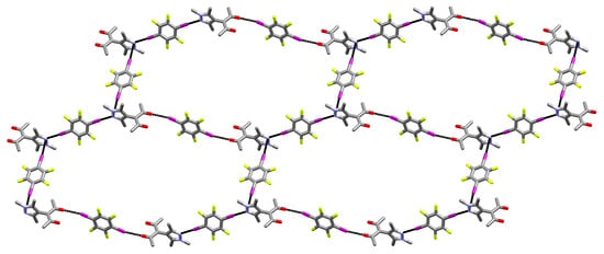 If the halogen bonds A and B are taken into account, an extended 1D structure can be derived. This chain expands along [3 0 2] in a “zig-zag” manner. Adding the third halogen bond C (C–I⋯πPz) to the contacts, a two-dimensional net can be perceived. It expands in the (–2 3 3) plane and no strict analogy can be found in the Reticular Chemistry Structure Resource (RCSR) []. If the N1 sites are perceived as triconnected vertices and the net is simplified by treating all edges as equivalent, its topology matches the honeycomb hcb net (Figure 3).