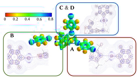 Center: Electrostatic potential of 1, mapped onto an isosurface of = 0.07 a.u. (scale given in the top left) []; excerpts of the Laplacians of contacts A to D are shown perpendicular to their respective TFDIB plane (contour lines drawn at a.u. with ).