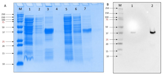 (A) SDS-PAGE 10% analysis of small-scale expression for the MERS-PLpro with poly His-tag of E. coli BL21(DE3) molecular weights for MERS-PLpro: 37. kDa. M = Precision Plus ProteinTM all blue standard protein marker from BioRad, lane 1 = crude extract, lane 2 = flowthrough, lane 3 = elution after 10 mM imidazole wash, lane 4 = blank, lane 5 = crude extract, lane 6 = flowthrough, lane 7 elution after 30 mM imidazole wash. (B). Western blot M = Precision Plus ProteinTM all blue standard protein marker from BioRad, lane 1 = crude extract, lane 2 = elution after 30 mM imidazole wash.
