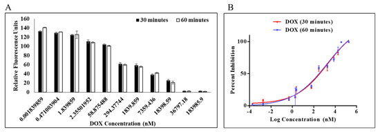 A PLpro inhibition assay was performed to determine the efficacy of doxorubicin as an inhibitor against PLpro protease. Dose-dependent inhibition of PLpro by DOX was measured by protease inhibition assay in which fluorescence from AMC was continuously monitored. Enzymatic activity was measured using a previously reported procedure for the continuous enzymatic inhibition experiment [17,32], and by holding the amounts of the enzyme and substrate constant while changing the quantity of chemical, inhibition curves were generated (Figure 2). Enzymatic inhibition activity of DOX at concentration 1.84 pM–183.98 µM was calculated at the initial slope in each curve (Figure 2B). It is interesting to note that DOX had a dose-dependent impact on the activity of the PLpro enzyme (Figure 2A). The estimation of an apparent inhibition at various dose and time points was made by the nonlinear regression analysis using a straightforward inhibition model. This apparent inhibition was noted in the IC50 values of 1.67 and 1.79 μM at 30 min and 60 min, respectively. Both 30 and 60 min were reported to evaluate the effect of incubation time on the protease inhibition. DOX can be expected to bind to the active site and behave as a competitive inhibitor (Table S1). The change in IC50 post 30 min of incubation was insignificant from 60 min.
