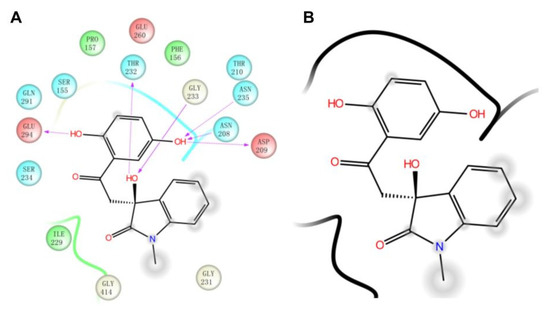 Then, we also conducted a further analysis of the binding mode of compound 4244-3659 to HK-II (Figure 5). The compound 4244-3659 molecule consists of two main rings, the hydroquinone ring (ring A) and the benzo butyl lactam ring (ring B). The hydroxyl group at the meta-position on ring A as a hydrogen bond donor forms a hydrogen bond with the side-chain carbonyl oxygen of Asp209. In addition, protons on Asn235 and Asn208 form two hydrogen-bonding interactions with oxygen atoms on the hydroxyl group. Meanwhile, the hydroxyl group at the ortho position on ring A forms a hydrogen bond with the carboxyl oxygen atom at Glu294. The phenyl ring in ring A forms a Van der Waals interaction with the Phe156 and Pro157 nonpolar amino acids. The strong hydrogen bonding and hydrophobic interactions allow ring A to bind to the center of the receptor active site pocket stably. The benzene ring stretches to the edge of the pocket as ring B turns outwards, which avoid the collision between ring B and the surrounding amino acids, while it is beneficial to the formation of hydrogen bonds between the hydroxyl oxygen atoms on the butyrolactam ring and hydrogen atoms on the Gly233 skeleton, as well as the hydrogen atoms on hydroxyl and the side chain oxygen atoms on Thr232. It was obtained from the analysis that more hydrogen bonds existed between the 4244-3659 molecule and the amino acids around the receptor active pocket. Overall, the higher ratio of the acceptor/donor of HB increases the ligand and protein binding ability, and the hydrogen bonding interaction stabilizes ligand receptor binding. The hit molecule 4244-3659 can be used as a lead compound for the development of HK-II inhibitors.
