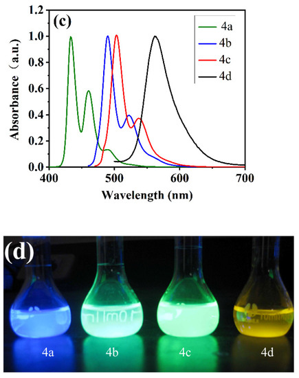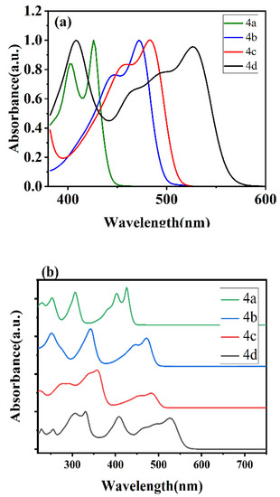 All compounds show complex absorption spectra. The absorption spectra of compound 4a in diluted CH2Cl2 solutions show two main absorption band peaks at 426 and 402 nm (Figure 1a,b and Table 1). The absorption peaks at 306 nm and 253 nm may be related to the electron transfer caused by the alkyl chain (Figure 1b). The absorption spectrum of compound 4b is similar, but shows a pronounced bathochromic shift of the main absorption band peaks now located at 472 and 446 nm (Figure 1a,b and Table 1). The 44 nm bathochromic shift of the absorption peak was attributed to the elongation of conjugation. Compared with 4b, 4c shows a slight bathochromic shift of the main absorption band peaks located at 483 and 457 nm (Figure 1a,b and Table 1). The reason can also be attributed to the elongation of conjugation. The maximum absorption peak of 4d was observed at 526 nm bathochromically shifted by ca. 43 nm as compared with 4c. Given the π-conjugation extension from 4a to 4c, it was shown that the bathochromic shift between 4c and 4d is most likely due to the electron supplying capacity of donor substituents.