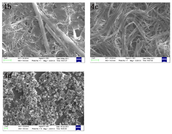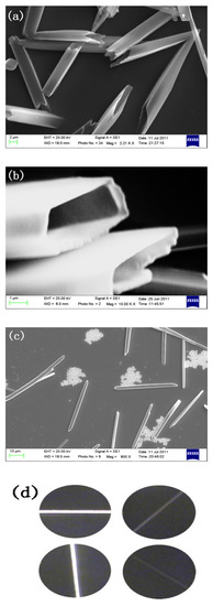 We also use the same method to study the other compounds; the other types of self-assembly morphology were observed from SEM and the results are shown in Figure 5. For 4b and 4c, the micro-wire morphology was fabricated by the same method as for 4a. The long microstructures can contribute to the stronger short range intermolecular interaction. For 4d, the intramolecular interaction is obviously weaker, so the self-assembly structures of 4d showed smaller sizes than those of others. However, the micro-square tube cannot be observed for 4b–4d.