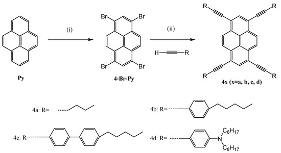 Synthesis of 1,3,6,8-tetrabromopyrene (4-Br-Py) and 1,3,6,8-tetrakis(ethynyl)-pyrene derivatives 4a–4d. Reagents and conditions: (i) Br2, Ph-NO2, 130 °C, for 12 h, 80%. (ii) PdCl2(PPh3)2, CuI, PPh3, Et3N/THF (1:1), 12 h, 80 °C.