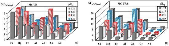 Selectivity tests for Ce(III) sorption using the MC-UR (a) and MC-UR/S (b) sorbents and the multicomponent equimolar solutions—effect of the pHeq on SCCe/metal (SD: 1 g L−1; C0: ≈1 mmol L−1; time: 10 h; v: 210 rpm; T: 22 ± 1 °C).