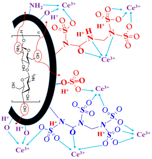 Sodium bisulfite ~40%, formaldehyde 38% in H2O, chitosan (25% degree of acetylation, DA), epichlorohydrin (EPI) 98%, urea >99%, NaOH anhydrous ≥98%, calcium chloride anhydrous >97%, glutaraldehyde solution (25% w/w), and sodium nitrite ≥99.0% were supplied by Sigma-Aldrich (Merck-KGa, Darmstadt, Germany). Neodymium sulfate (used in the selectivity experiments) and cerium sulfate were provided by the National Engineering Research Center of Rare Earth Metallurgy and Functional Materials Co., Ltd. (Baotou, China). MgCl2·6H2O, AlCl3·6H2O, CuSO4, and ZnCl2 were obtained from Guangdong Guanghua, Sci-Tech Co., Ltd. (Guangdong, China).