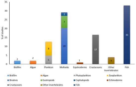 Biomarkers are defined as suborganic changes that occur at the cellular, physiological or molecular level, measurable in cells or tissues of an organism, which may be indicative of exposure [19]. To be a useful bioindicator, an organism must have certain characteristics such as a wide geographical distribution, long life duration, being easy to capture, a feeding mode that allows the accumulation of contaminants present in the environment (e.g., filtration) or the ability to accumulate and tolerate high concentrations of organic and inorganic contaminants in their tissues [20,21]. The use of sentinel species to monitor environmental pollution allows knowledge of the bioavailability of pollutants in the environment over prolonged periods of time [22]. In addition, information on the concentration of pollutants in different organisms is quite useful for considering toxicological and public health aspects of pollution in natural systems [23]. Among the distinct species used as bioindicators, fish and bivalves, particularly mussels, stand out, as the latter are present on coasts all over the world, are easy to capture and are filter-feeders [24,25]. However, it is necessary to study pollution in species other than mussels to assess trophic transfer in aquatic ecosystems. Figure 1 displays the number of studies devoted to the analysis of PhACs for each group of marine organisms according to the literature consulted in scientific databases. It shows that fish have been by far the most investigated in this field. This section summarises the use of some species belonging to the diverse levels of the trophic chain as bioindicators of pollution.