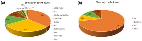 Extraction techniques (a) and clean-up treatments (b) used in the reviewed publications.