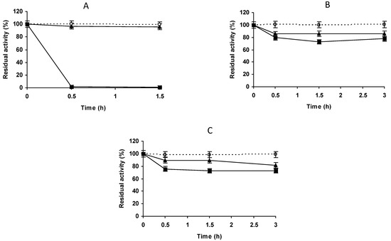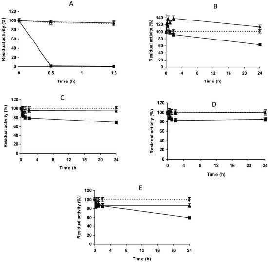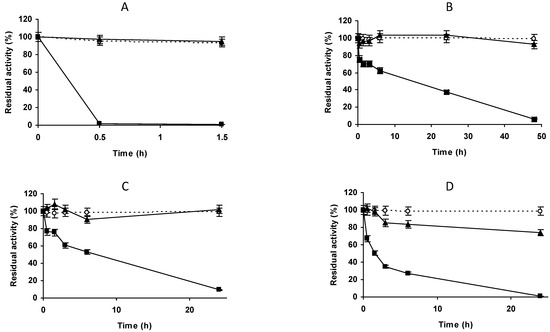 - Iyer, P.V.; Ananthanarayan, L. Enzyme stability and stabilization-Aqueous and non-aqueous environment. Process Biochem. 2008, 43, 1019–1032. [Google Scholar] [CrossRef]