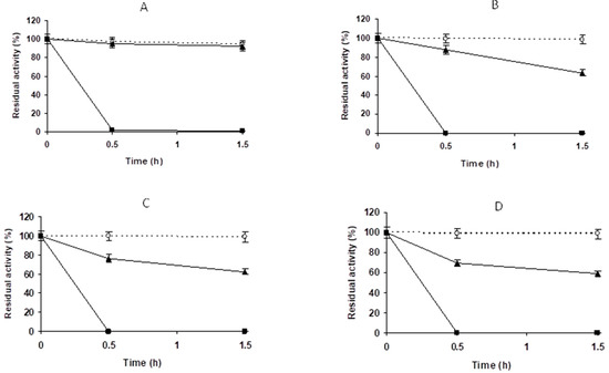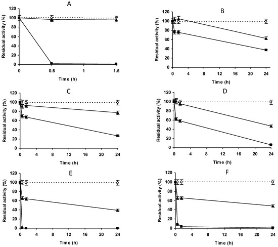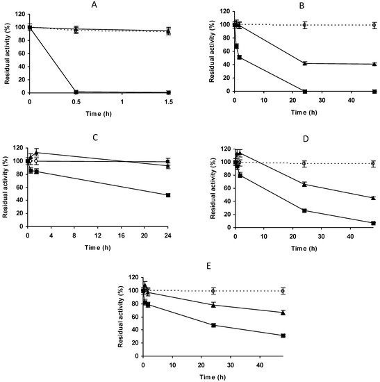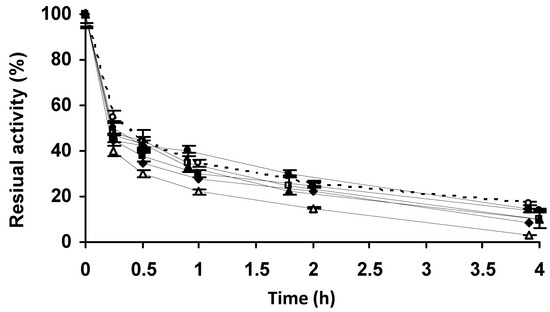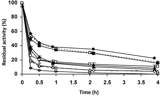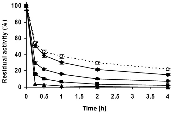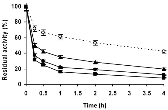 The different biocatalysts were inactivated by incubation in 50 mM Tris-Cl at pH 8.0 in a water bath with the temperature set at 65 ºC. Periodically, samples were taken, and their residual activities were determined using the NIPAB assay described above, considering the initial activity of the preparation as 100% and referencing the activity of the other samples to this initial value as a percentage.