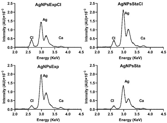 The chlorine present in the AgNPs prepared in a medium without added NaCl could come from the residual chloride salts in the extracts used in the preparation of the culture media. The low, but significant, amounts of Cl in the AgNPs prepared with a NaCl-containing medium come from the Cl provided by this salt, as found in other reports [52,53].