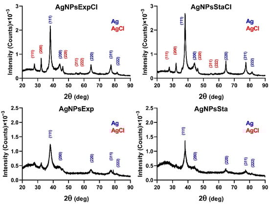 Nanoparticles’ crystallinity determination. XRD patterns of the AgNPs with the indicated planes of Ag0 (blue) and AgCl (red) crystals.