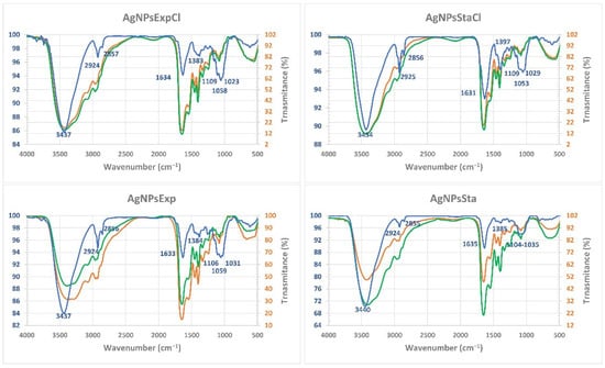 Characterization of the corona components of AgNPs and broths. AgNPs’ spectra are shown in blue; the broths before synthesis are in orange and after synthesis in green. The wavenumber of the principal bands of AgNPs are indicated.