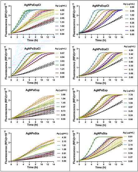 In general, MIC and MBC values of the AgNPs were the same or MBC ≤ 4 × MIC, revealing a bactericidal mode of action in all bacteria evaluated for most of the AgNPs, as suggested in [63].