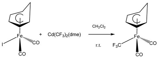 Upon treating (C6H7)Fe(CO)2I with Cd(CF3)2(DME) in anhydrous dichloromethane at ambient temperature; a slow reaction occurred that turned the brown solution yellow; converting the iodide to the new (C6H7)Fe(CO)2CF3 as shown in Figure 1. The progress of the reaction was monitored by 19F NMR spectroscopy which indicated the disappearance of the peak at −36.8 ppm (2JF-Cd = 454 Hz); due to Cd(CF3)2(dme), [15] and the appearance of new signals at −0.8 and −0.2 ppm for (C6H7)Fe(CO)2CF3. These signals are consistent with the region previously reported for Fe-CF3 bonds [16,18]. As it has been observed for similar reactions; the yield of the yellow air-sensitive solids was enhanced by the addition of CuBr to the reaction mixture [15].