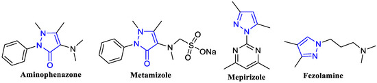 The combination of other physiologically active groups in the heterocyclic compounds structure can lead not only to an increase in the main therapeutic effect, but also to the emergence of new types of biological activity [39]. It is also known that many nitrogen-containing heterocyclic compounds are used in pharmaceutical practice as broad-spectrum drugs [40,41,42]. Pyrazole derivatives occupy a special place among them due to the greater preparative availability. In recent years, this has been caused by the increasing use of its derivatives as drugs, dyes, luminescent and fluorescent substances [43]. Pyrazole derivatives have proven to be effective pharmaceuticals with a variety of therapeutic activities, such as Mepirizole and Fezolamine (Figure 2), showing anti-inflammatory and antidepressant activities [44,45]. And, of course, among pyrazole derivatives, there are found substituted antipyrines (1-phenyl-2,3-dimethyl-5-pyrazolone) synthesized more than half a century ago, namely Aminophenazone and Metamizole, which exhibit antipyretic and analgesic effects [46,47] (Figure 2).