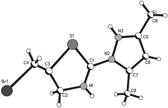 X-ray diffraction investigation was carried out in order to establish the spatial structure of the 5-(bromomethyl)-2-(3,5-dimethyl-1H-pyrazol-1-yl)-4,5-dihydrothiazole molecule 8. The molecule 8 general view is shown in Figure 3.