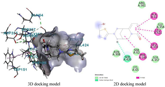 Derivative 11 showed a higher binding energy of −6.6 kcal/mol with Penicillin binding protein 4 (PBP4) E. coli “Homo sapiens” due to one carbon-hydrogen bond of the carbon atom (C-4) of the piperidine core of cytisine (Figure 6).
