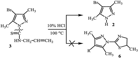 The following transformations in order to obtain new physiologically active compounds which combined the basic pyrazole ring and the sulfur-containing thiazole heterocycle in their structure were carried out. The ampoule cyclization of N-allyl-(4-bromo-3,5-dimethyl-1H-pyrazole)-1-carbothioamide 3 under the action of a hydrochloric acid solution was carried out by analogy with the procedures for N-allylthiocarbamides 4a–c cyclization. However, when processing the reaction mixture, the expected corresponding cyclic 1,3-thiazoline 6 was not isolated, but the initial 4-bromo-3,5-dimethylpyrazole 2, which was probably formed as a result of conventional hydrolysis at the C–N bond between the pyrazole ring and thioamide fragment (Scheme 3).