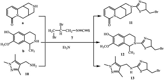 Thiazole derivatives that combine physiologically active alkaloids in their structure, namely cytisine and salsoline [77,78] which can potentially exhibit high pharmacological activity, are of particular interest. The reaction positive results prompted us to check the reproducibility of this reaction on the example of some biologically active alkaloids (cytisine a, salsoline b), as well as methylamino-substituted pyrazole (1,3,5-trimethyl-1H-pyrazol-4-yl)methanamine 10, synthesized according to the method (Scheme 5).