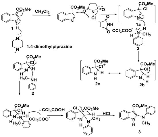 Mechanism for synthesis of compound 3 was illustrated in Scheme 2. Conversion of 1 into the intermediate 3-chloro-indolenine 1a using N-chlorosuccinimide (NCS) in the presence of a base was the generally accepted, then cyclic carbenium ion 2b was obtained upon protonation of 1a, possibly stabilized by the cyclic chloronium ion intermediate 2c, finally, nucleophilic attack of aniline nitrogen to afford 3 as dePicted below in Scheme 2.