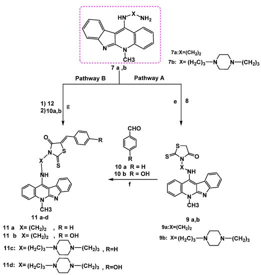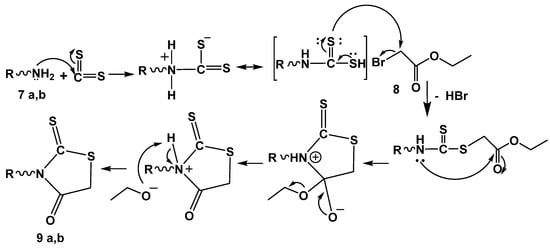 To improve the anticancer activity of the neocryptolepine core structure, the synthesis of novel neocryptolepine conjugated with rhodanine moiety was elaborated. To that end, a three-component reaction of amines 7a,b, carbon disulfide, and ethylbromo acetate 8 in acetonitrile at room temperature provided the cyclized intermediates 9a,b via an addition–elimination reaction at room temperature, as shown in Scheme 7 and Scheme 8.