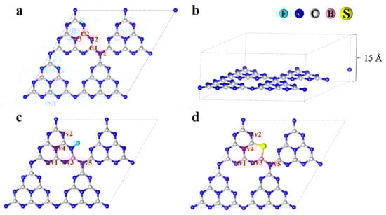 Pure bulk g-C3N4 is built on the hexagonal heptadiazine-based structure as it is the most stable graphitic phase [47], and it contains two or three different kinds of C and N atoms, which are marked as C1-C2 and N1-N3, respectively, as shown in Figure 1a,b. According to the experimental results, B-N bonds and N-F bonds existed in the XPS spectra of B-F-co-doped g-C3N4 [25], indicating that B atoms preferentially replaced C atoms (C1), and F atoms tended to combine with N atoms (N2) to be doped into the interspace, as shown in Figure 1c. There are 5 possible sites where Nv can be introduced, namely, Nv1-Nv5 in B-F-co-doped g-C3N4, as shown in Figure 1c. For B-S-co-doped g-C3N4, similar possible doping sites are provided, as given in Figure 1d, based on the experiment [26]. The optimal doping site can be determined by the formation energy (Eform), according to the following equation: