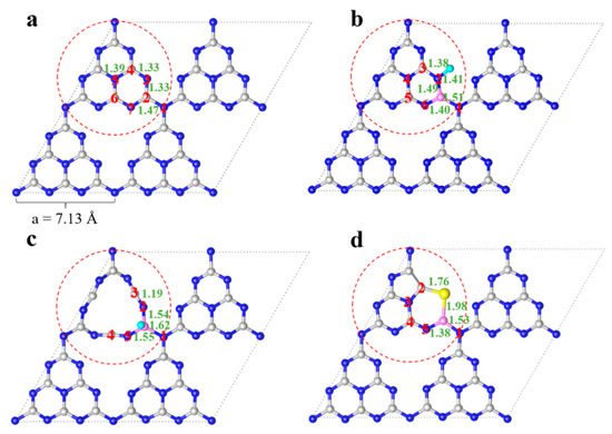 The optimized geometries and bond lengths of g-C3N4 (a), B-F (b), B-F-Nv (c), and B-S-Nv (d).