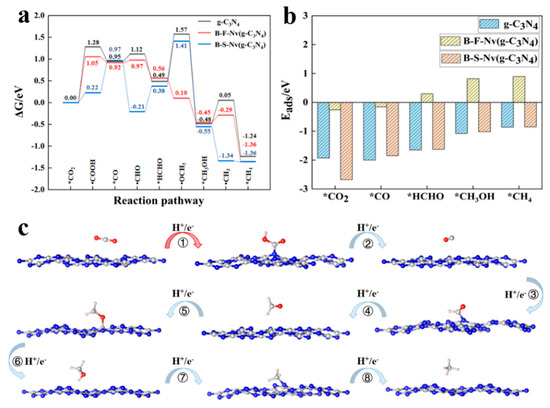 Carbon dioxide is a very stable linear molecule, and the photocatalysts with a suitable conduction band potential to convert carbon dioxide into hydrocarbon fuel are highly desirable. The selectivity of g-C3N4 to the reduction product is still controversial and the yield is low. In addition, how the doping modification affects the catalytic performance and product selectivity of g-C3N4 should also be investigated. The Gibbs free energy curve and adsorption energies of products in different stages for g-C3N4, B-F-Nv, and B-S-Nv are presented in Figure 6, as well as the representative geometries of the stable points in the specific reduction process of CO2 on g-C3N4. The photocatalytic CO2 reduction pathways are similar for all three catalysts, i.e., *CO2→*COOH→*CO→*CHO→*HCHO→*OCH3→*CH3OH→*CH3→*CH4 as proposed by Azofra et al. [49]. The speculated probable products are CO, HCHO, CH3OH, and CH4, which are 2, 4, 6, and 8 electron processes, respectively. Further, Yu et al. [57]. Experimentally synthesized a g-C3N4 catalyst and applied it to the reduction of CO2 under UV-Vis radiation, confirming that the main product of CO2 reduction was CH3OH and that it reached a yield of 0.81 μmol·g−1. In the Gibbs free energy diagram calculated in this paper, it can be seen that △G = −0.48 eV when CO2 is reduced to CH3OH, and 0.53 eV of energy needs to be absorbed in the subsequent reaction. Therefore, it can be seen that methanol exists stably, and methanol is the final reduction product, which is consistent with the experiment [57].