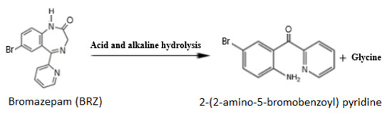 - Panderi, I.; Archontaki, H.; Gikas, E.; Parissi-Poulou, M. Acidic hydrolysis of bromazepam studied by high performance liquid chromatography. Isolation and identification of its degradation products. J. Pharm. Biomed. Anal. 1998, 17, 327–335. [Google Scholar] [CrossRef]
