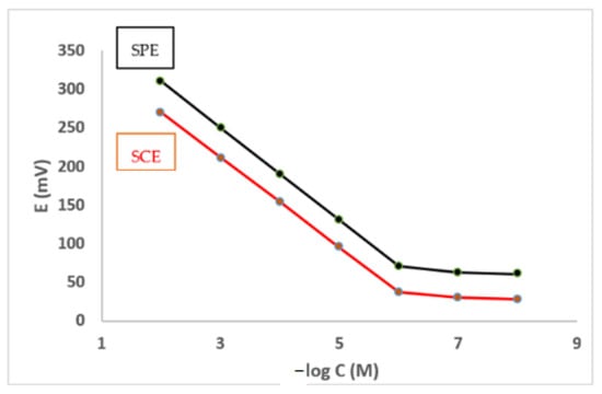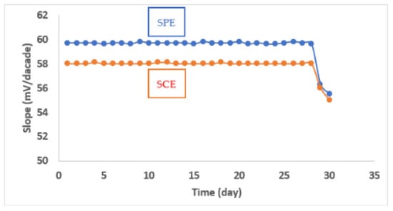 | Slope (mV decade−1) * | 59.70 ± 0.40 | 58.10 ± 0.60 | 52.00 ± 0.10 | 50.00–65.00 | 57.00 ± 0.22 | 50.00–65.00 |