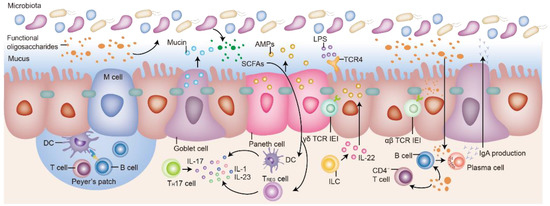 Schematic diagram of the modulating effect of functional oligosaccharides on the intestinal immune barrier. SCFAs: short chain fatty acids; AMPs: antimicrobial peptides; LPS: lipopolysaccharide; M cell: membranous/microfold cell; DC: dendritic cell; T cell: T-lymphocyte cell; B cell: B-lymphocyte cell; Th17 cell: T helper cell 17; IL-1/17/22/23: interleukin 1/17/22/23; Treg cell: regulatory T cell; TCR: T cell receptor; ILC: innate lymphoid cells; CD4+ T cell: cluster of differentiation 4 T cell; IgA: immunoglobulin A.