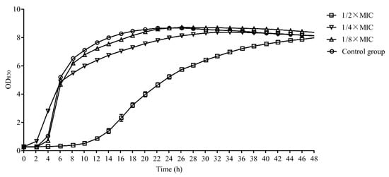 The lag phase of S. aureus was extended to 10 h when L-36 CFCS with the 1/2 × MIC concentration were treated. However, the growth of S. aureus had little effect when L-36 CFCS with the 1/4 × MIC and 1/8 × MIC concentration were treated (Figure 1).