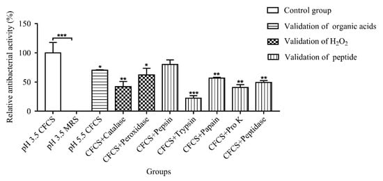 Analysis of antibacterial active substances in CFCS. Statistically significant differences (determined by Student’s t test) are indicated as *** p < 0.001, ** p < 0.01, and * p < 0.05 vs. the control.