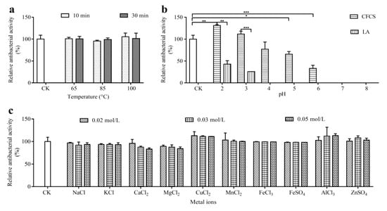 The effects of temperature (a), pH (b) and metal ions (c) on the antibacterial activity of L-36 CFCS against S. aureus. CK is untreated L-36 CFCS. Statistically significant differences (determined by Student’s t test) are indicated as *** p < 0.001, ** p < 0.01, and * p < 0.05 vs. the control.