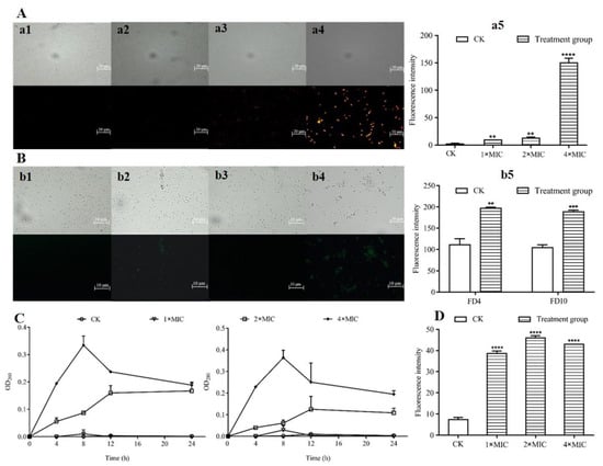 The pore size of the cell membrane of S. aureus treated with L-36 CFCFS was measured by using FD4 and FD10 as the fluorescent marker (Figure 5B). Fluorescence microscopy results demonstrated that no green fluorescence was observed in S. aureus that were untreated with L-36 CFCFS, but it was observed in S. aureus treated with 1 × MIC concentration of L-36 CFCFS. Fluorescence intensity were tested by the automatic microplate reader; the results demonstrated that the fluorescence intensity was detected in S. aureus cells with 1 × MIC concentration of L-36 CFCS, which were significantly higher than untreated S. aureus cells (Figure 5B(b5)).