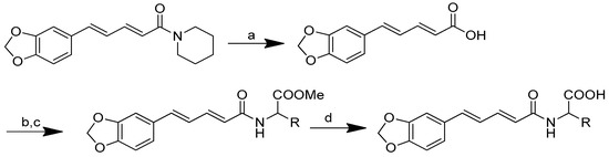 The synthesis of amino acid–piperine conjugates has been described as having the potential to produce antileishmanial [34] and anticancer agents [35]. As piperine is naturally abundant, this compound is a favourable choice for manipulation via this approach. Furthermore, the chemical reactions and processes involved are simple and straightforward, making the scaled-up manufacturing of piperine derivatives highly possible [35].