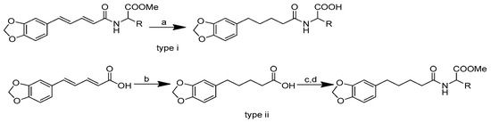 The synthesis of amino acid–piperine conjugate was divided into three series (Scheme 1). First of all, piperine was converted to piperic acid via the hydrolysis of its amide bond. The carboxyl group in piperic acid provides a place for the formation of a covalent bond with the amino acids through the formation of a new amide bond. Piperic acid was then conjugated to a protected amino acid using menthane-sulfonyl chloride, CH3SO2Cl, in CH2Cl2 at 0 °C to produce piperoyl–amino acid methyl ester conjugates. The desired piperoyl–amino acid methyl ester conjugates (3–7) were reported to be in the range of 40–75% yields. Later, deprotection was conducted using Al2O3 in microwave-assisted solid phase until the ester group was converted into free carboxyl groups (8–12) with 70–80% yields. The other analogues are the saturated derivatives of the conjugate of the first series. The approach used for the synthesis of these analogues was carried out in two ways, namely, (i) the direct hydrogenation of the first series’ conjugate, and (ii) the initial hydrogenation of piperic acid to give tetrahydropiperic acid, followed by the conjugation of the saturated piperic acid with amino acid methyl esters [34] (Scheme 2).