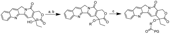 The conjugation of 50 kDa poly-R-(L-glutamic acid) (PG) and L-camptothecin was achieved by means of the esterification of the hydroxyl group at the C-20 position with amino acid as a linker (Scheme 3). Amino acid was added to a solution of camptothecin, DMAP and DIPC in DMF at room temperature to form amino acid–camptothecin. Then, 50% TFA was used to deprotect the amino acid linker. Thereafter, an amino-acid-linked camptothecin solution in anhydrous DMF was added to the poly-R-(L-glutamic acid) solution. The DMAP and DIPC in DMF were gradually added to the combination and chilled in an ice bath. The mixture was stirred for two days at room temperature [45].