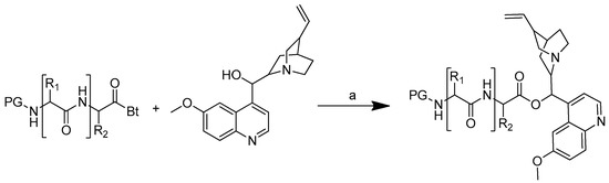 The synthetic strategy used was to form an ester bond between the quinine and amino acid or peptide. The amino acid or peptide was selected based on the difference in the amino acid polarity. Quinine was O-acylated with N-protected acylbenzotriazoles in the presence of anhydrous potassium carbonate in anhydrous DMF for 10 to 30 min at 50 °C to produce amino acid and peptide conjugates of quinine (Scheme 4). The reaction time was shortened by utilising microwave irradiation, which is important for minimising the formation of epimers during the conjugation process [51].