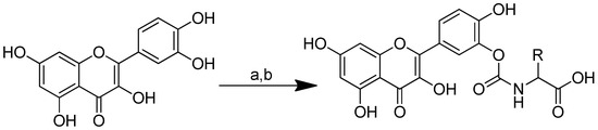 Quercetin–amino acid conjugates are produced through the synthesis of quercetin with nonpolar amino acids (alanine, valine, phenylalanine and methionine), which are positively charged (lysine) and negatively charged (aspartic acid, glutamine) by binding the amino acid to the B-ring of quercetin via a carbamate linker. Due to the acidity, high oxidability and reactivity of the catechol moiety, the protected amino acids’ interaction with excess quercetin primarily caused the esterification of the B-ring hydroxyls [68]. The series of quercetin–amino acid conjugates were produced as follows: synthetic amino acid carbamate derivatives of quercetin were produced through the conversion of amino acids to the corresponding activated urethanes, followed by alcoholysis with quercetin. At room temperature, amino acids, bis(4-nitrophenyl) carbonate and N, N-diisopropylethylamine were added to the solution. The mixture was agitated for a further 12 h at room temperature after quercetin was added. To produce the required quercetin prodrugs, the tert-butyl-amino acid quercetin carbamates were deprotected with TFA at 0 °C (Scheme 5) [66].