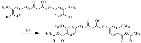 Different curcumin conjugates were produced, including 4,40-(di-O-glutamoyl) curcumin, 4,40-(di-O-valinoyl) curcumin, 4,40-(di-O-glycinoyl) curcumin, monoglycinoyl curcumin and monovalinoyl curcumin. Diester curcumin was synthesised using a synthetic approach, as shown in Scheme 7. The NH2 group of amino acids (glycine, valine, and glutamic acid) were protected as N-phthaloyl derivatives during diester synthesis. To obtain the corresponding acid chlorides, the carboxyl group was activated by treating it with thionyl chloride. Curcumin was suspended in dry pyridine and treated with the N-phthaloyl chlorides of the respective amino acids in a 1:2.5 molar ratio for six hours. Ammonia was used to remove the phthaloyl group, and column chromatography was utilised to purify the conjugates [78].