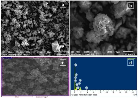 The elemental analysis was performed with a SEM-EDX micrograph in BT-An@Zetag, as shown in Figure 2a,b, respectively. Surface morphology was used to identify the inhomogeneous topography of minerals confined in a carbon matrix. The presence of C, O, Na, Mg, Al, Si, Ca, and Fe (C: 25.15, O: 54.47, Na: 0.74, Mg: 0.48, Al: 4.57, Si: 11.39, Ca: 0.75, S: 0.44, and Fe: 1.64%) for BT-An@Zetag was observed. Figure 2a,b shows the BT-An@Zetag SEM diagrams incorporating (BT-An) into the Zetag polymer; On the other hand, Figure 2a,b shows the production of the BT-An@Zetag composite with bright and opaque characteristics. SiO2 and Al2O3 were found as big particles with a diameter of 10 μm in BT-An@Zetag composites. The inclusion of anthracite and Zetag resulted in an increase in oxygen content and a decrease in carbon content in the BT-An@Zetag composite as a result of the binding with anthracite and Zetag. The increase in BT-An@Zetag composite holes leads to an increase in surface area (103.5 m2/g) after mixing with anthracite and Zetag at temperatures of 70 and 90 °C during the manufacturing and treatment of BT-An@Zetag composites. Volatile gases such as H2, CO, and CO2 evaporate at these temperatures, creating these gaps [42].